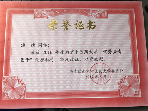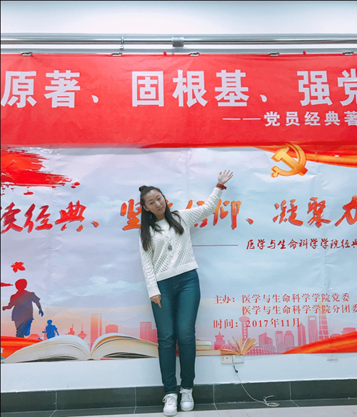 她勤思好学,2017学年综合测评成绩名列专业第二,在大一就通过了全国大学英语四、六级,计算机省级、全国一级考核“优秀”,获得校人民奖学金二等奖。她还被遴选参加公司的“本科生科创先锋计划”,跟随唐宗湘教授积极从事科学研究。