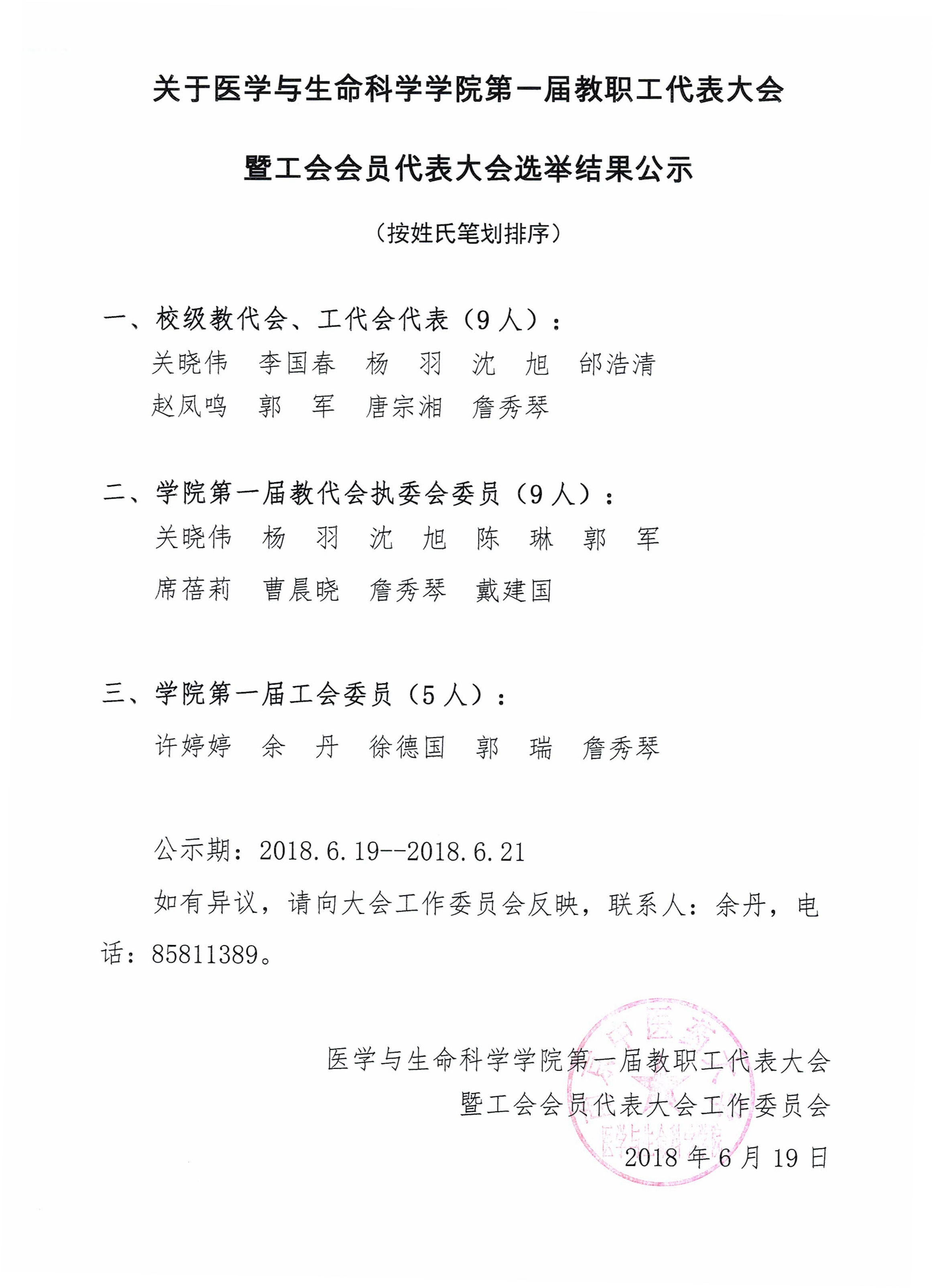 关于医学与生命科学公司第一届教职工代表大会暨工会会员代表大会选举结果公示