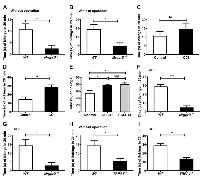 MrgprD (Mas-relatedG-protein-coupled receptor D)在背根神经节(DorsalRoot Ganglia, DRG)的小直径伤害性感受神经元特异表达,参与痛觉调节。研究人员采用行为学和生理学等实验技术手段,研究了MrgprD在CCI(chronic constriction injury)所致神经病理性疼痛的作用,并首次发现:(1)MrgprD和神经病理性疼痛的机械痛觉过敏和冷痛觉异常的发生相关,对于热痛觉异常则不相关;(2)TRPA1是MrgprD下游的离子通道,β-丙氨酸诱导的钙信号主要通过TRPA1进入细胞;(3)蛋白激酶A(PKA)是β-丙氨酸激活的MrgprD信号的下游通路;(4)CCI模型中β-丙氨酸诱导的疼痛行为明显增加,而瘙痒行为无变化,敲除TRAP1也减轻了β-丙氨酸诱导的CCI模型疼痛行为。