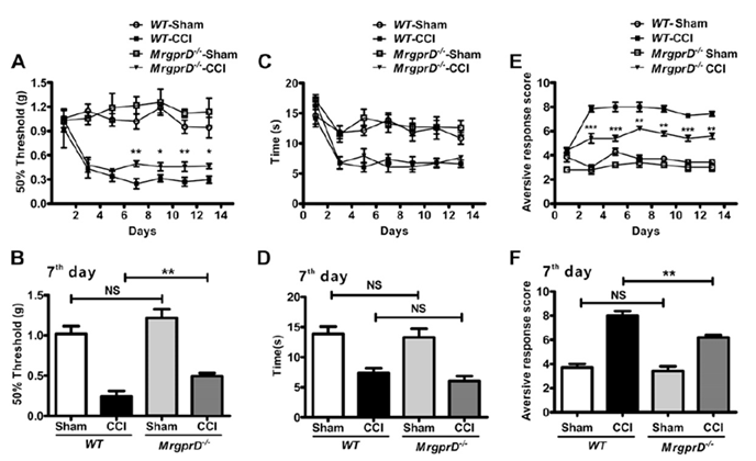 图 1. MrgprD在神经病理性疼痛冷痛和机械痛的产生是必要的
