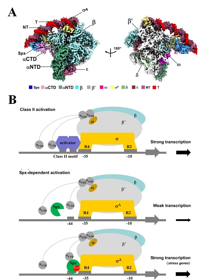 该研究利用单颗粒冷冻电镜技术(Single particle Cryo-EM)解析了含Spx的转录激活复合物Spx-TAC的电镜结构,捕获了氧化态Spx单体的转录激活状态,不仅以特有方式结合RNA聚合酶α亚基的C末端结构域(αCTD),预招募并促进氧化态Spx特异识别结合启动子DNA的-44元件,同时通过多个界面与启动子特异因子σA相互作用,稳定Spx-TAC复合物的结构,促进转录起始。该研究阐明了Spx介导的多种关键蛋白-蛋白、蛋白-DNA相互作用,回答了 Spx如何通过预招募模型和促进转录激活复合物形成进而激活氧化压力诱导的应激基因转录这一关键科学问题,同时也揭示了其在Spx-家族转录因子中的普遍调控意义,为新型抗耐药菌感染药物的研发提供新的靶点和思路。