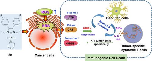 该研究设计合成了一系列Pt(II)-NHC化合物,它们在体外显示出高效的抗肝癌活性。研究发现,最优化合物2c是一种典型II型免疫原性细胞死亡(Immunogenic cell death,ICD)诱导剂,通过诱导肝癌细胞活性氧(ROS)的产生并伴有内质网应激(ERS)的共激活,导致损伤相关分子模式(DAMP)的释放,显著促进DCs成熟、相应细胞因子激活及T细胞增殖,进而提高肿瘤细胞免疫应答能力。