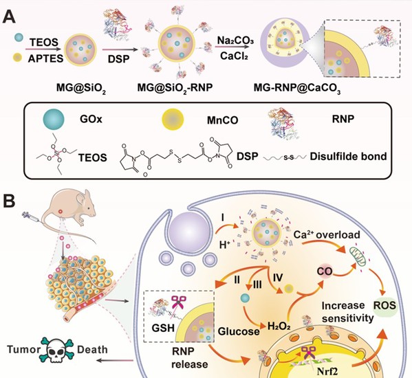 针对以上科学和技术问题,william威廉中文官网韩欣教授团队联合南京大学宋玉君教授团队基于无机二氧化硅纳米反应器构建了一种pH/谷胱甘肽(GSH)共刺激响应性CRISPR/Cas9基因编辑纳米递送平台,结合钙离子(Ca2+)增强CO气体疗法进行精准的肿瘤治疗研究。在该工作中,作者通过GSH响应性二硫键连接剂将CRISPR体系共价连接在二氧化硅纳米颗粒上,并在其表面功能包覆一层碳酸钙(CaCO3)用于保护其血液循环中的稳定性。当该纳米药物进入肿瘤微环境后,通过肿瘤酸性pH环境下诱导水解,导致CaCO3层快速生物降解,负载的葡萄糖氧化酶(GOx)通过联级酶促反应,一方面消耗肿瘤细胞内的葡萄糖进行“饥饿疗法”,一方面产生过量H2O2与负载的锰羰基(MnCO)反应产生CO实现气体的精确可控释放,实现高效低毒的癌症治疗。CO能够靶向肿瘤细胞线粒体,损害肿瘤细胞的线粒体生物能产生大量ROS,同时来自CaCO3降解产生的Ca2+超载能够干扰线粒体Ca2+稳态引起线粒体功能障碍。此外,肿瘤微环境中过表达的GSH诱导二硫键的裂解,释放出Cas9/sgRNA蛋白复合体进行特定部位的基因编辑,通过靶向应激缓解调节因子NRF2降低肿瘤细胞对于Ca2+增强CO气体疗法的应激耐受性,实现了有效杀伤肿瘤同时降低毒副作用的目的。这种智能可控的治疗策略充分结合了CRISPR精准基因编辑以及离子和气体的协同抗肿瘤作用,在未来的精准基因编辑和纳米医学临床应用中显示出巨大的潜力。