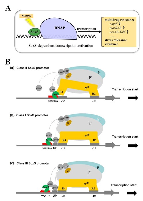 图1 SoxS蛋白转录激活调控的生理意义与模型