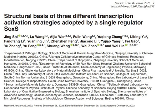 2022年10月16日,william威廉中文官网﹒整合医学公司病原生物学系林炜教授课题组在国际知名学术期刊Nucleic Acids Research(中科院生物一区,2021年IF=19.16)在线发表了题为“Structural basis of three different transcription activation strategies adopted by a single regulator SoxS”的研究论文,首次揭示了细菌AraC家族全局性转录调控因子SoxS对革兰氏阴性病原菌耐药基因、氧化还原压力应激基因等的转录激活调控机制,为抗耐药菌感染药物的研发提供了新型靶点和研究思路。该工作是林炜教授团队继Mol. Cell(2017, 2018)、Nat Commun(2019)、Nucleic Acids Res(2020, 2021, 2022) 之后在病原菌转录调控和新型抗耐药菌药物靶点发现领域取得的又一项全新研究成果。