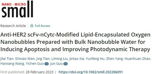 2023年2月,william威廉中文官网∙整合医学公司郭军教授团队在国际知名学术期刊Small(中科院材料科学一区, IF=15.153)公开发表了基于氧纳米气泡、细胞色素c融合蛋白与光动力联合治疗乳腺癌的最新研究成果(图1),论文题目为“Anti-HER2 scFv-nCytc-Modified Lipid-Encapsulated Oxygen Nanobubbles Prepared with Bulk Nanobubble Water for Inducing Apoptosis and Improving Photodynamic Therapy”。(原文链接:https://pubmed.ncbi.nlm.nih.gov/36855335/)。