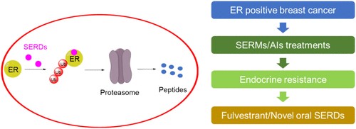 此外课题组近期还以Perspective的形式在药物化学权威期刊《Journal of Medicinal Chemistry》发表了题为“Selective Estrogen Receptor Degraders (SERDs): A Promising Strategy for Estrogen Receptor Positive Endocrine-Resistant Breast Cancer”。该论文详细综述了目前雌激素受体阳性乳腺癌的临床分型、发病原因、耐药机制及目前治疗方法。当下针对雌激素受体阳性乳腺癌主要治疗方法为以雌激素受体调节剂(SERMs)和芳香化酶抑制剂(AIs)为代表的内分泌治疗,但内分泌治疗主要问题是3-5年后的复发和耐药。氟维司群是目前针对内分泌耐药患者获批上市的雌激素受体下调剂(SERD),但其肌肉注射的给药方式导致患者依从性较差,可口服SERDs的研发就成了目前该类型乳腺癌药物研发的重要方向,论文综述了可口服SERDs的发展历程,对目前在临床阶段的SERDs化合物进行了详细的总结和分析,为雌激素受体阳性乳腺癌的治疗提供了新的思路。青年教师路云龙为该论文第一作者和共同通讯作者,刘武昆为该论文最后通讯作者。