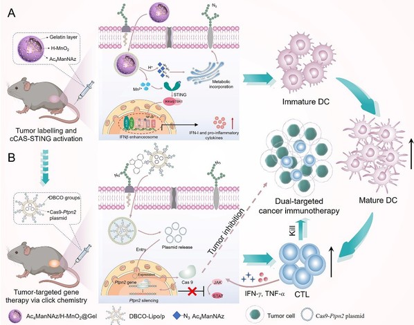 通过生物正交反应实现CRISPR/Cas系统的靶向递送及级联免疫激活示意图