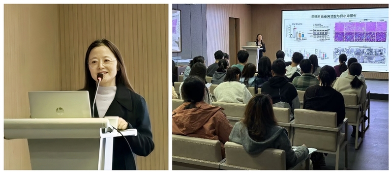 孔令东教授的报告题目为“中药调控肾小球足细胞衰老的作用机制研究”,她从肾小球足细胞衰老调控肾病发生的新机制发现为切入点,发现中医经方四物汤能够抑制肾小球足细胞衰老改善肾病,其中,阿魏酸是关键有效成分。孔教授的精彩报告根植中医药特色理论,紧密结合临床实际问题,从细胞分子机制到疾病干预策略,报告内容深入浅出、逻辑缜密,为广大青年教师和研究生的科研选题与设计提供了有效借鉴。