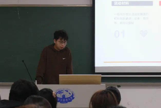实践部副部长姜金名主要讲解了活动策划书的撰写,他以“繁星•平凡榜样”活动策划书为例,从活动主题、活动背景、活动内容等方面进行详细解读,帮助新生团干初步了解实践活动的策划流程。