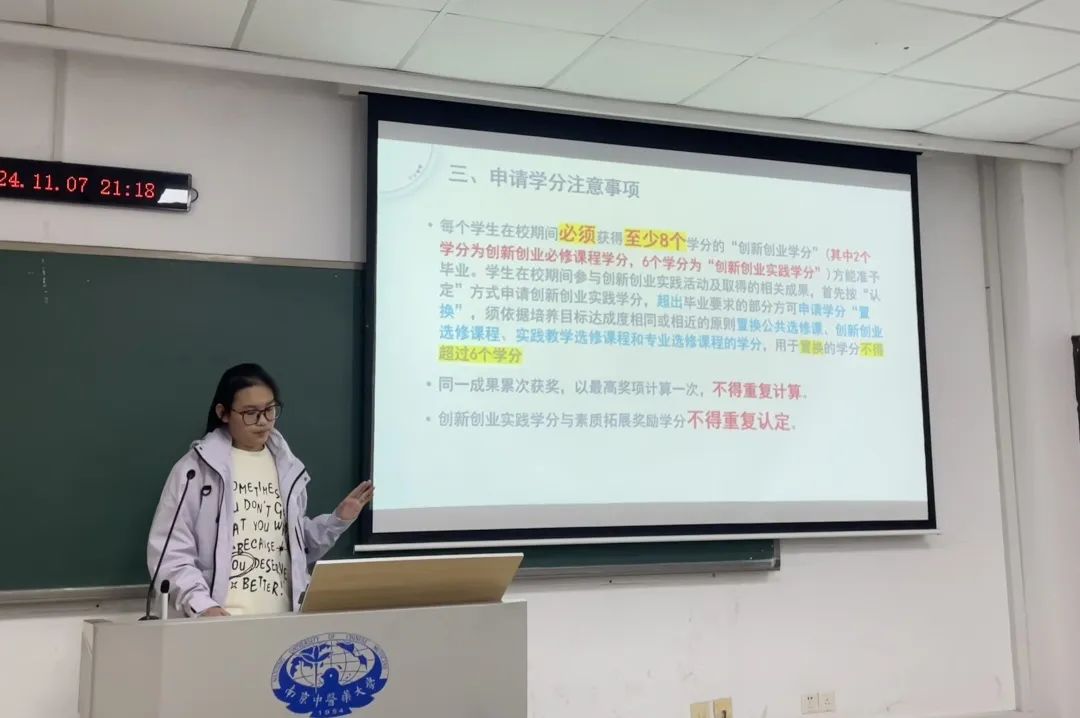 科创部部长刘耀慧重点阐述了“创新创业学分的审核与申请”。她还详细介绍了“中国国际老员工创新大赛”“挑战杯”等大型赛事的基本情况,激发新生团干对创新创业的兴趣,鼓励他们团结带领同学们开拓创新思维,挖掘创新项目。