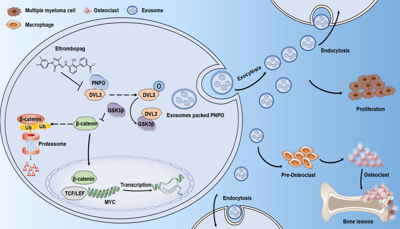 2024年12月11日在Advanced Science发表“PNPO-mediated Oxidation of DVL3 Promotes Multiple Myeloma Malignancy and Osteoclastogenesis by Activating the Wnt/β-catenin Pathway”的研究论文。该研究成果基于“以毒攻毒”治疗恶性肿瘤的中医药理论,应用毒性中药来源的抗肿瘤活性的天然化合物——雷公藤红素(Celastrol,Cel)为探针,结合高通量高灵敏蛋白芯片、蛋白质谱等多组学技术,筛选并鉴定了与MM细胞异常增殖及骨破坏相关的致癌基因PNPO(Pyridoxine-5'-phosphate oxidase,磷酸吡哆醇氧化酶),证实PNPO氧化dishevelled 3(DVL3)蛋白M282位点增强其与GSK3β的结合,减少β-catenin泛素化降解,从而异常激活Wnt/β-catenin信号上调MYC基因表达,增强MM细胞增殖能力的作用机制。此外,该研究成果基于PNPO主要活性位点R95/K117开展老药新用的筛选,发现促血小板生成素受体激动剂艾曲波帕(Eltrombopag,Elt)可通过靶向PNPO降低其对DVL3的氧化作用,并在细胞、动物、临床水平研究中呈现出良好的抑肿瘤作用,为“以毒攻毒”理论指导MM临床治疗提供了新的科学证据。