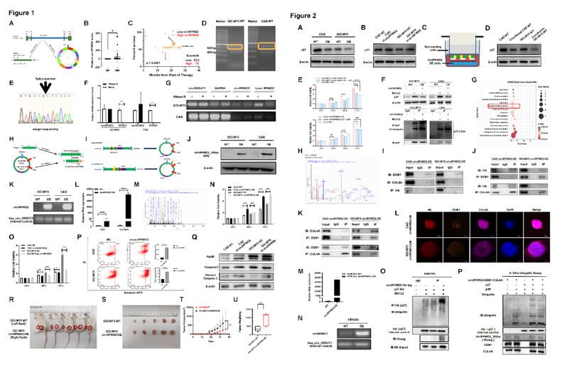 2024年11月22日在Experimental Hematology & Oncology发表题为“CUL4A-DDB1-circRFWD2 E3 ligase complex mediates the ubiquitination of p27 to promote multiple myeloma proliferation”的研究论文。前期研究发现,一种可编码环状RNA——circRFWD2 (hsa_circ_0015361)是高危多发性骨髓瘤(MM)的治疗靶点,该成果进一步发现其编码蛋白circRFWD2_369aa进入骨髓微环境影响细胞中p27表达水平,证实了circRFWD2_369aa可以与CUL4A、DDB1形成E3连接酶复合物调控MM细胞中p27的泛素化水平,并揭示其促进MM细胞恶性增殖的潜在机制。该成果从全新视角提出环状RNA发挥功能作用的途径,加深了人们对MM发病机制的理解,展现了circRFWD2(hsa_ circ_0015361)作为一种新的生物标志物的潜力,为MM精准治疗和预后评估提供了新的思路。