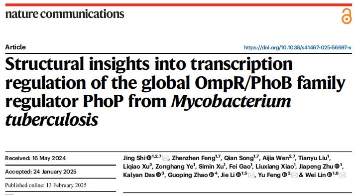 2025年2月13日,william威廉中文官网林炜教授团队、鼓楼临床william威廉中文官网感染科李婕教授团队与浙江大学william威廉中文官网冯钰教授团队合作在Nature子刊Nature Communications发表题为Structural insights into transcription regulation of the global OmpR/PhoB family regulator PhoP from Mycobacterium tuberculosis的研究论文。该研究解析了结核分枝杆菌毒力因子PhoP与靶标基因启动子DNA及RNA聚合酶的复合物电镜结构,揭示了PhoP调控磷源、氮源压力应激基因转录的双重转录调控机制,为全面认识结核分枝杆菌在宿主体内的逆境生存机制奠定了基础。该成果是在前期Mol. Cell(2017, 2018)、Nat Commun(2019)、Nucleic Acids Res(2020, 2021, 2022a, 2022b)、PNAS(2023)、iScience(2024)研究基础上,从病原微生物基因转录调控机制层面发现的新型抗感染药物靶标。