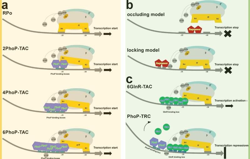 该研究运用冷冻电镜技术解析了三种结核分枝杆菌全局性调控蛋白PhoP依赖型转录激活复合物(PhoP-TACs)的结构,并构建了PhoP依赖型转录抑制复合物(PhoP-TRC)的调控模型,揭示了PhoP与启动子DNA、RNA聚合酶作用双重调控下游基因转录的分子机制。在PhoP-TACs中,PhoP的C端DNA结合结构域可首尾相连串联成二聚体、四聚体或六聚体,特异识别启动子DNA上的相应结合位点(PHO box),PhoP的N端应答结构域通过与RNA聚合酶的保守结构域广泛相互作用而进一步稳定复合物结构,促进转录起始。在PhoP-TRC中,1个PhoP二聚体通过PhoP-PHO box、PhoP-GlnR和αCTD-DNA 相互作用竞争性结合启动子DNA上游的GlnR结合位点,并显著扭转DNA。PhoP 通过这种独特结合产生的空间位阻效应阻止额外GlnR分子的结合,进而发挥“竞争性抑制”转录的作用。该研究系统揭示了结核分枝杆菌PhoP依赖型双重转录调控机制及共性调控元件,为抗结核菌潜伏感染药物研发提供了新靶标和新思路。